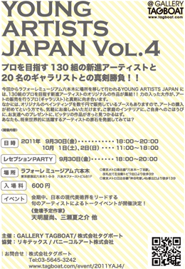 YOUNG ARTISTS JAPAN VOL.4 コメントを残す YOUNG ARTISTS JAPAN VOL.4 開催日時 2011年 9月30日(金)18:00~20:00 2011年10月1日(土) 、2日(日) 11:00~18:00 レセプションパーティー 2011年 9月30日(金) 18:00~20:00 開催場所 ラフォーレミュージアム六本木 東京都港区六本木1-9-9 六本木ファーストビルB1F 入場料 600円 【展示風景】
